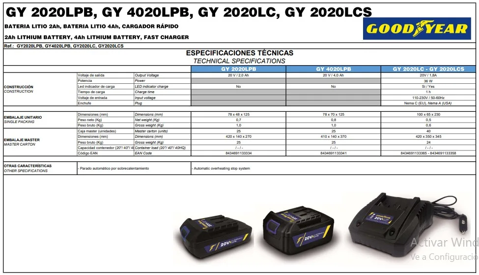 Bateria Litio Goodyear 20v 2,0 Ah Gy2020lpb Cuadrada