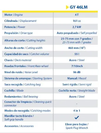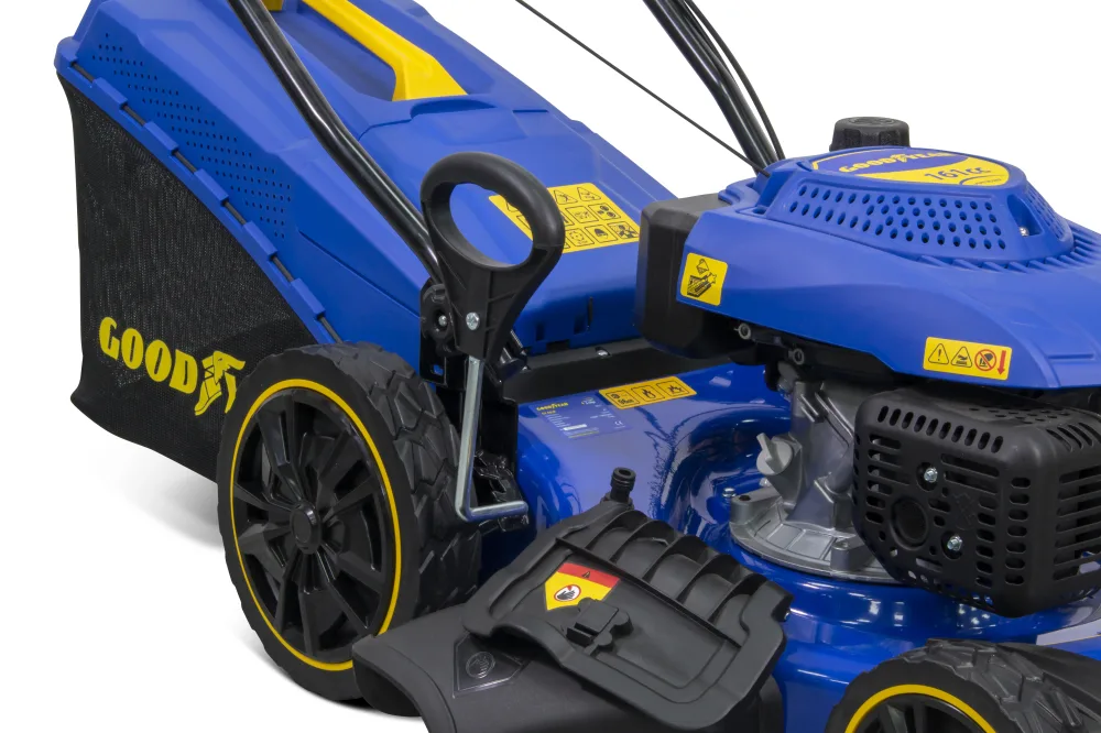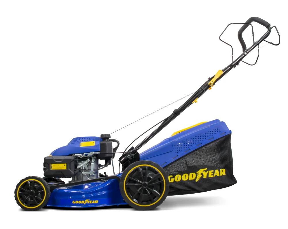 Cortacésped de gasolina Goodyear con potencia de 161cc y ancho de corte de 46cm es un cortacésped para usuario semi-profesional o doméstico. El cortacésped GY46LM nos permite cortar césped en terrenos de hasta 1000m2. Este cortacésped es autopropulsado, de esta manera nos cansaremos menos al trabajar con él, su chasis de acero lo hace realmente resistente a la hora de sufrir choques con la superficie o algún elemento. Podemos adaptarlo a 7 alturas distintas para ajustarlo a nuestra necesidad real del corte de nuestro césped. Este cortacésped es un 4 en 1, eso quiere decir que tiene, salida trasera para saco o sin saco, salida mulchin y salida lateral, con la salida mulchin fertilizaremos nuestro césped a la vez que lo cortamos.